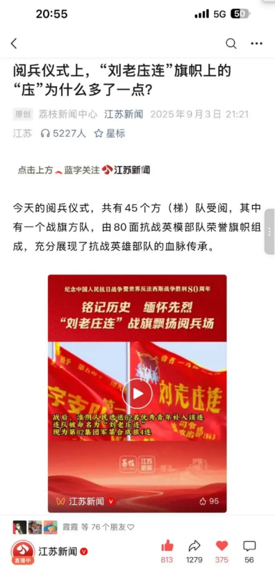 江蘇廣電聚焦九三閱兵重大活動,以九三閱兵中“劉老庒連”戰(zhàn)旗“庒”字多一點的細節(jié)切入,通過深入采訪,講述了“劉老庒連”的英勇事跡和這面旗幟的來歷。閱兵儀式當(dāng)晚,報道在“江蘇新聞”公眾號首發(fā),獲10萬+閱讀量,被新華社、《人民日報》等多家央媒和地方媒體轉(zhuǎn)載,作品激發(fā)正能量,發(fā)揮黨媒輿論引領(lǐng)作用,產(chǎn)生廣泛影響。